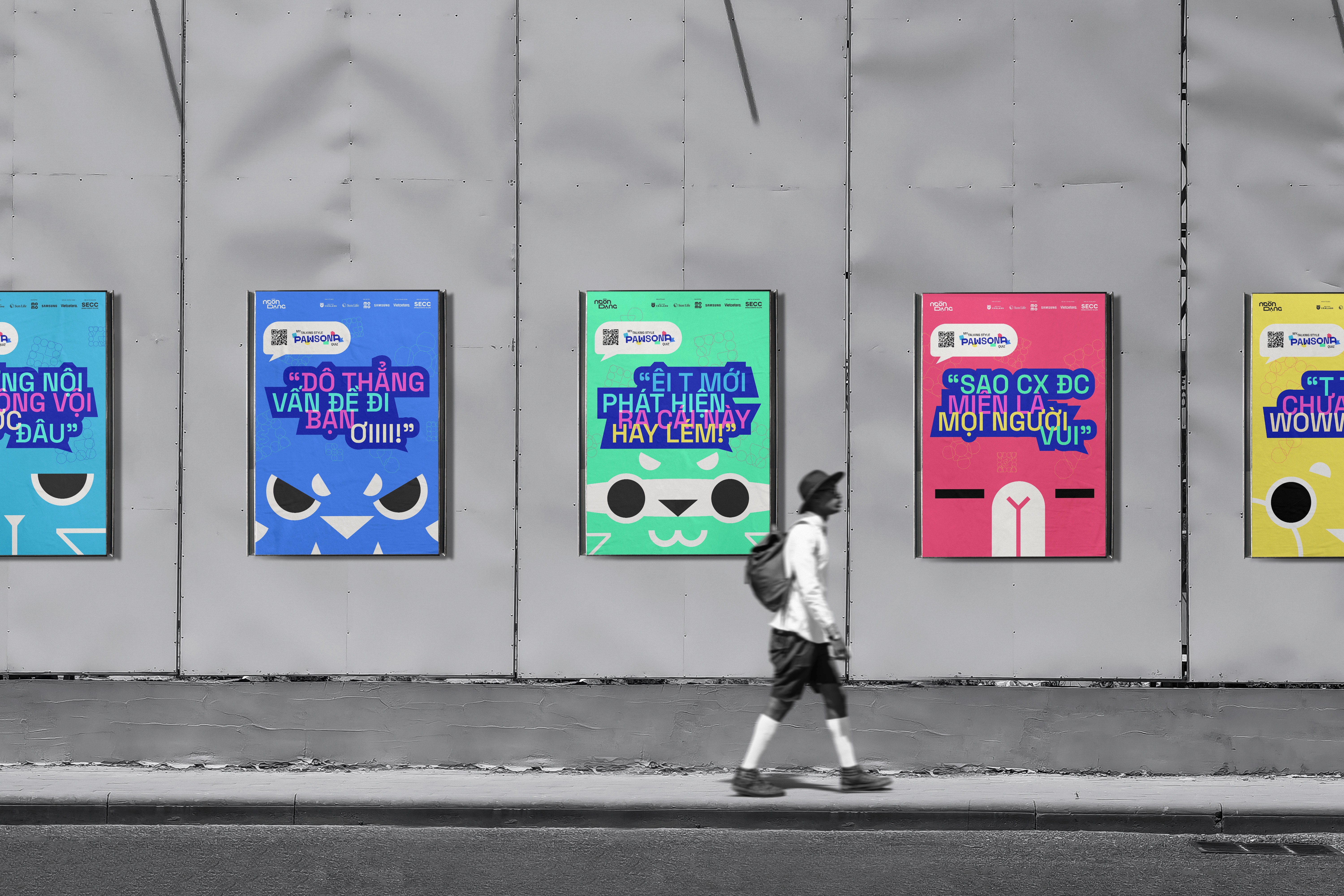 To raise awareness among young people, I developed a modular visual system — a flexible yet distinctive identity for the campaign — that would evoke both diversity and uniqueness in individual communication styles. The deliverables are campaign materials (posters, billboards, and brochures), digital content, and on-site tools such as wayfinding, tickets, and merchandise. Variety and distinction in characters are referenced in every element of the visual identity, from the mix-and-match of bespoke Ngôn Dạng Mono and Space Grotesk, representing verbal communication between people, to the graphic elements: bold, overlapping variations that serve as natural communication strengths in each of us. Meanwhile, the vibrant contrasting color scheme reflects the two distinctive thinking styles, i.e, cool colors for linear thinking and warm colors for configural thinking. From typeface to structure, from posters to tickets, the design narrates an experience that’s both dynamic and individualistic.